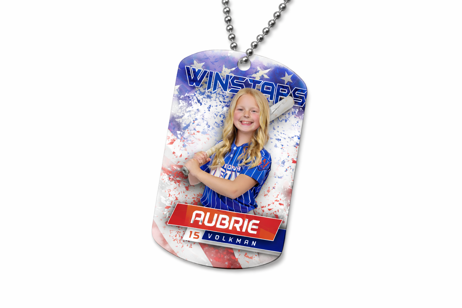 A custom sports dog tag featuring the athlete’s photo on both the front and back, creating a bold and meaningful keepsake. Durable and lightweight, it’s perfect for athletes, parents, and fans who want to carry a piece of the season with them.